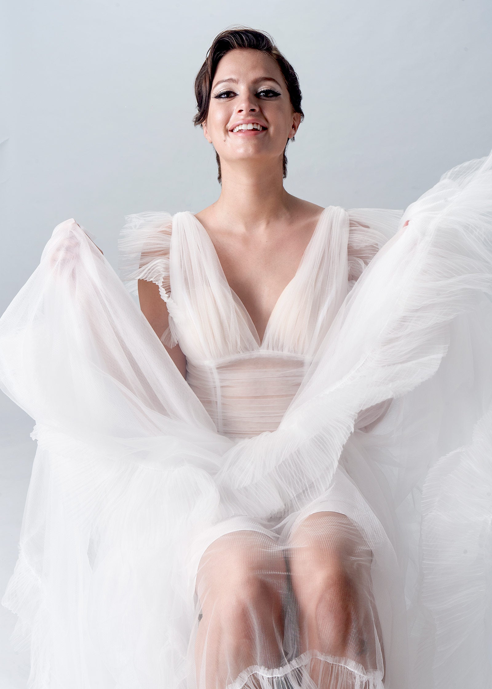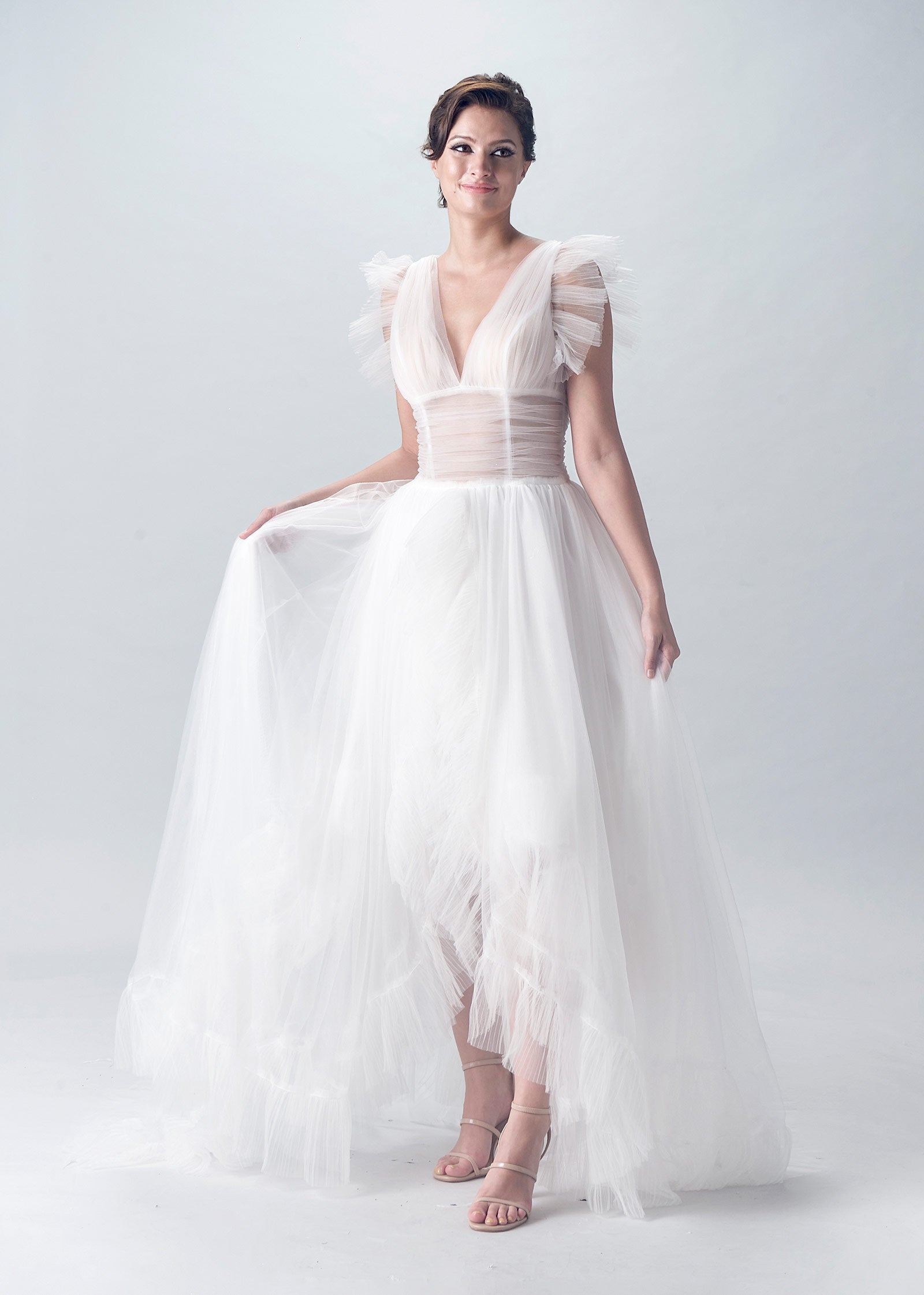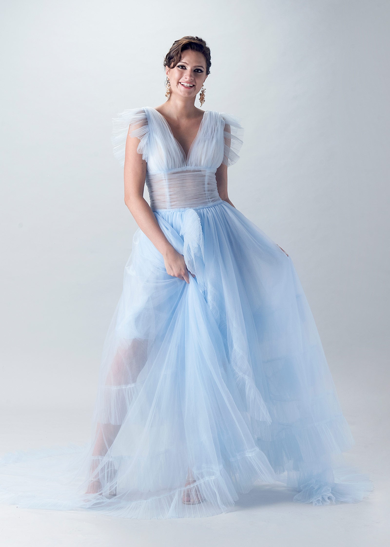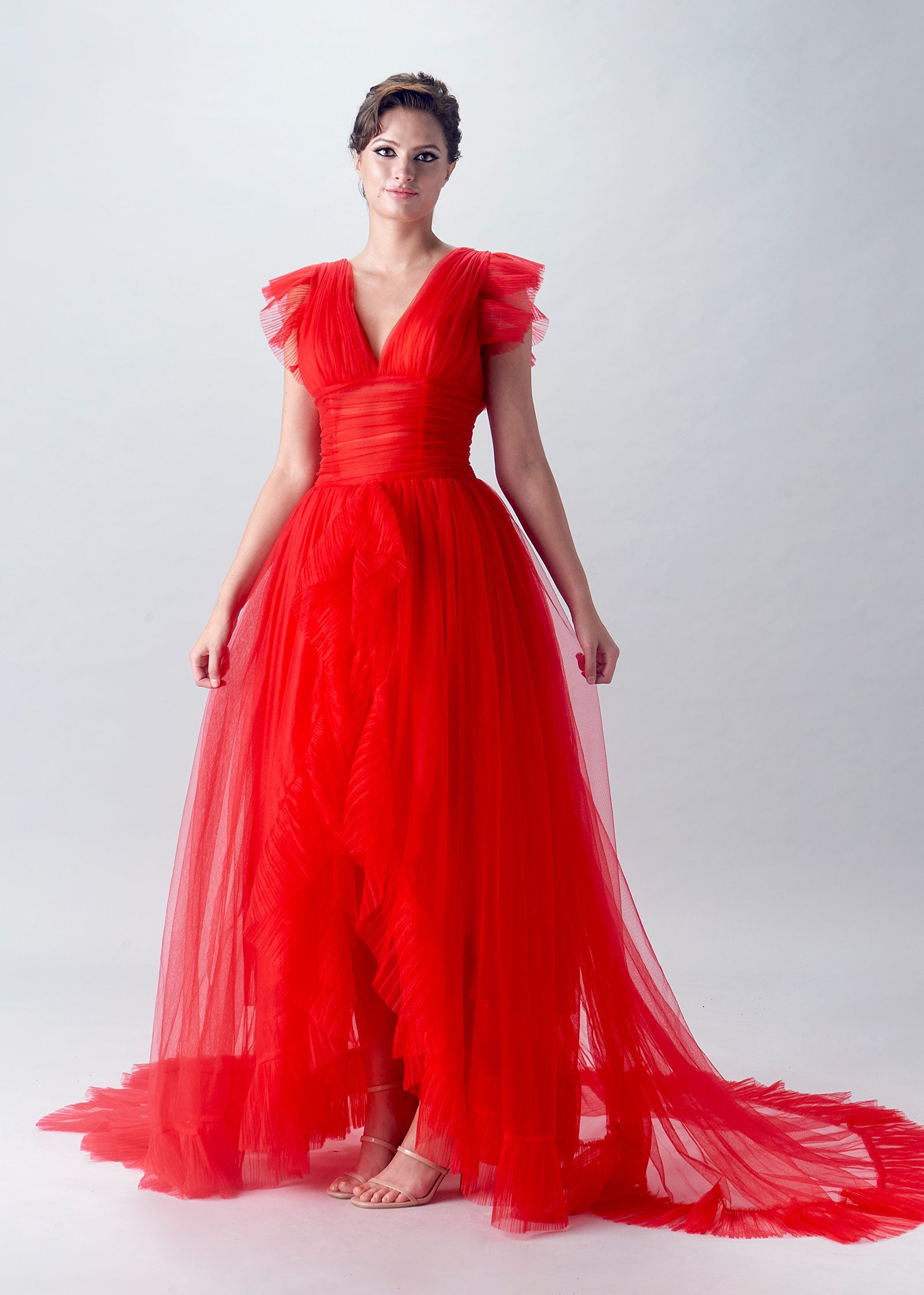 Romantic edgy ball gown with layers and layers of pleated ruffle details and Semi transparent bodice.